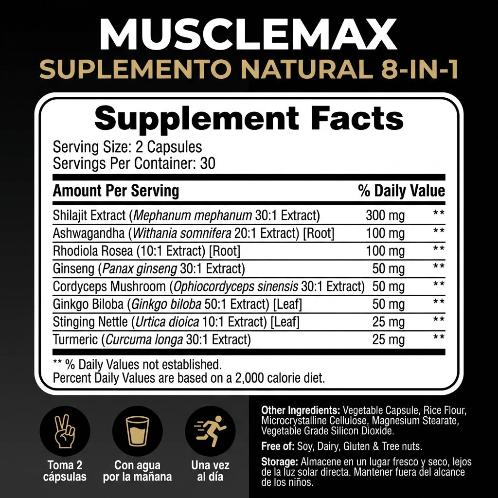 MuscleMax contiene 8 adaptógenos respaldados por cientos de estudios científicos revisados por pares. Ingredientes como Ashwagandha, Shilajit y Rhodiola han demostrado aumentar testosterona, energía y rendimiento en múltiples ensayos clínicos.